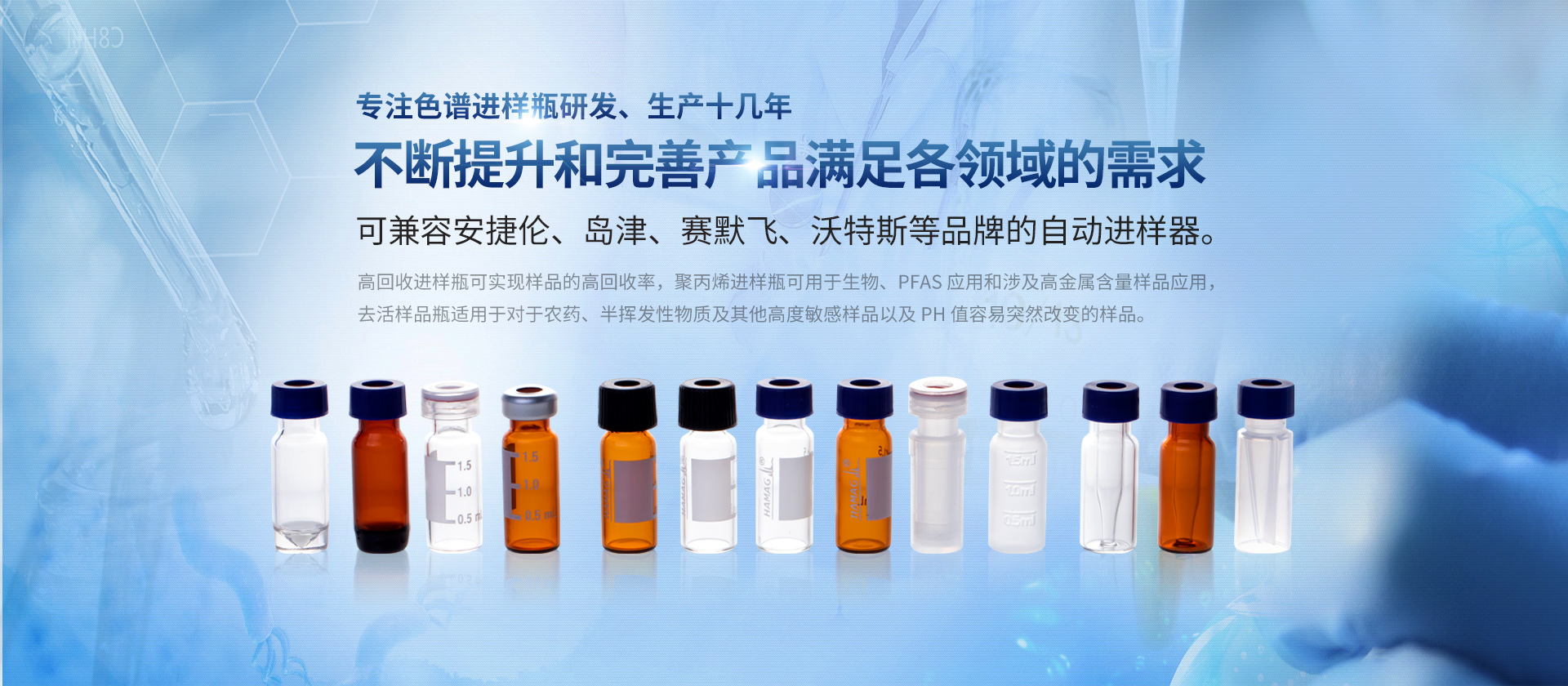 浙江哈邁科技有限公司(簡稱HAMAG),成立于2005年,總部位于美麗的海濱城市寧波,是中國優(yōu)質(zhì)色譜進(jìn)樣瓶、樣品瓶供應(yīng)商,是一家專業(yè)從事色譜耗材的科研、設(shè)計、生產(chǎn)、銷售和系統(tǒng)集成為一體的生產(chǎn)型企業(yè)。經(jīng)過十幾年的研發(fā)與努力,通過和國內(nèi)外多個科研部門,浙江大學(xué)理工學(xué)院,同時與品牌:安捷倫、沃特世、島津等公司的技術(shù)交流與學(xué)習(xí),我們成功的研制開發(fā)出實驗室分析設(shè)備專用的各種型號的自動進(jìn)樣瓶、頂空瓶及其配套蓋墊;特氟龍與硅膠復(fù)合墊片;特氟龍/硅膠制品;創(chuàng)新型固相萃取儀;針式過濾器等幾十種實驗室耗材及關(guān)聯(lián)產(chǎn)品...